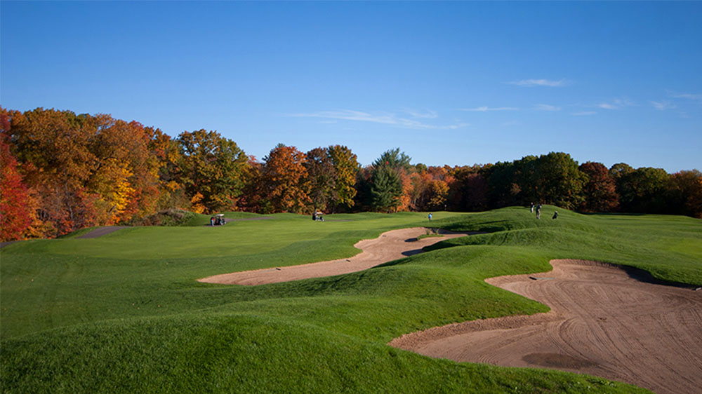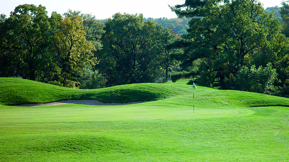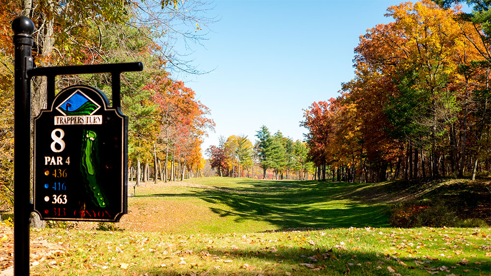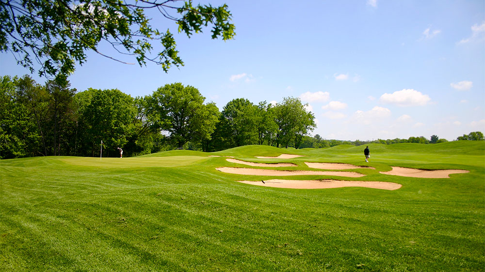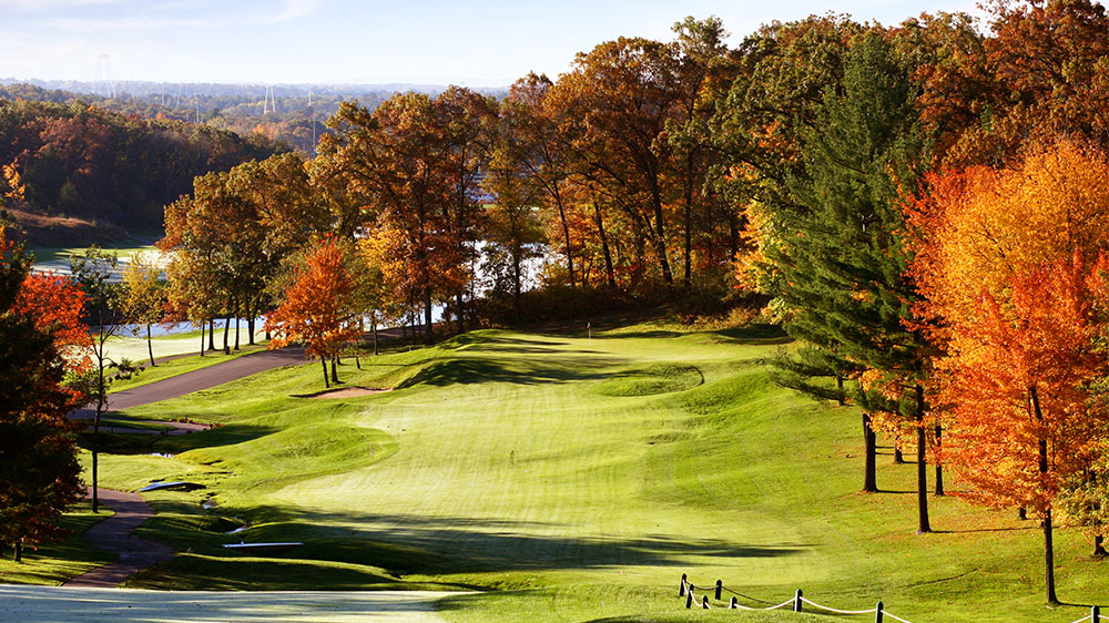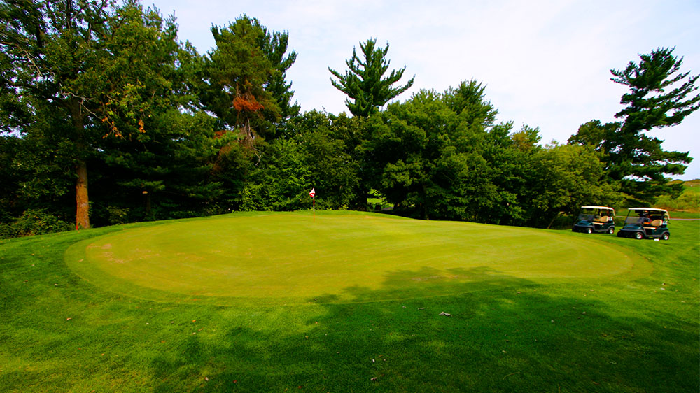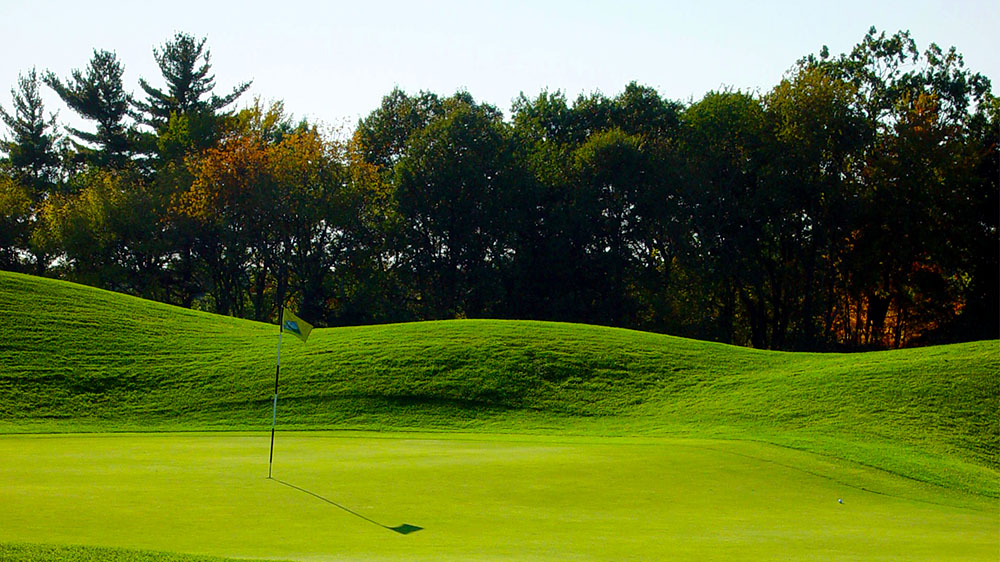 One of three great finishing holes; long and narrow flanked by oak and pine trees. The slight dogleg right requires a left to right or straight shot from the tee. An ample sized green is guarded by bunkers front and left.