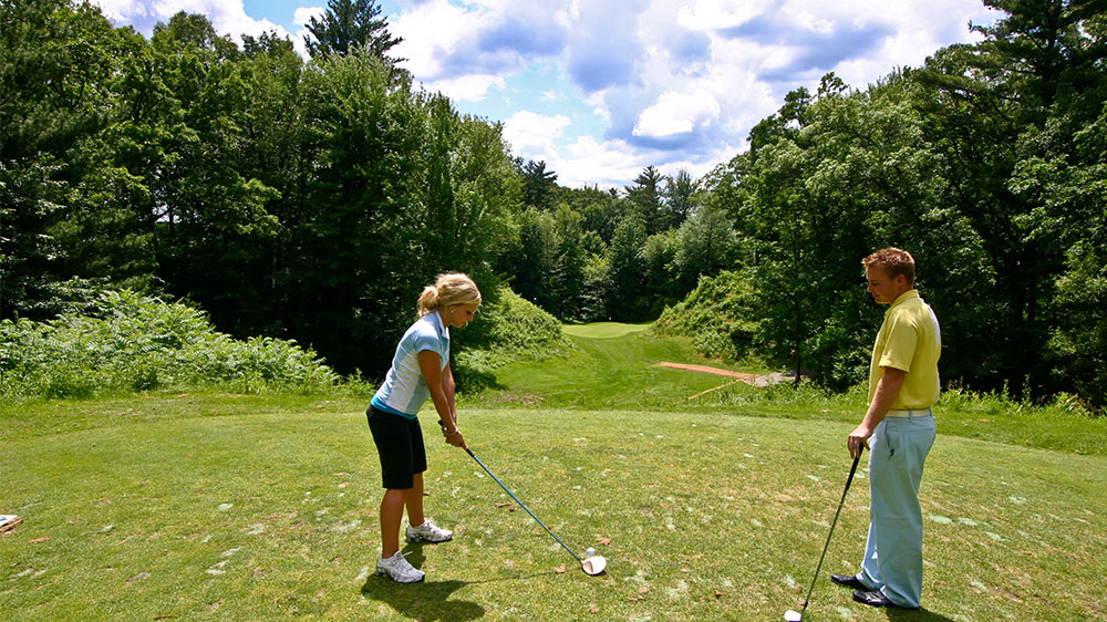 The "Canyon" hole is more forgiving than it looks. An errant shot will often carom or funnel towards the green. An elevated tee requires one club less than normal.