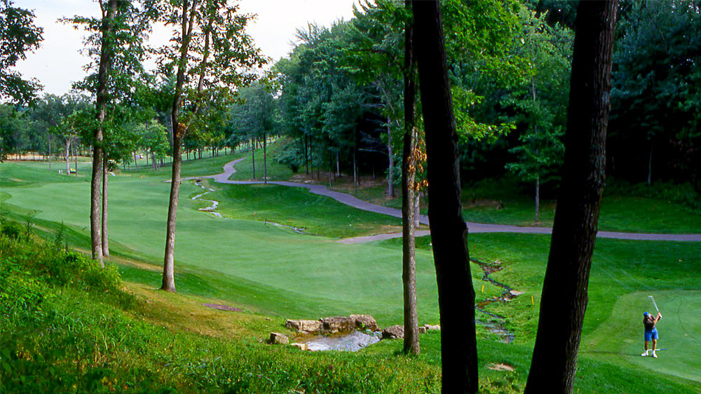 Aim between fairway pine and right bunker off tee. Longer hitters may choose to drive over right side of fairway pine to reach down slope. Second shot depends on placement of drive and navigation of stream that diagonals the fairway. Green is guarded by left front bunker.